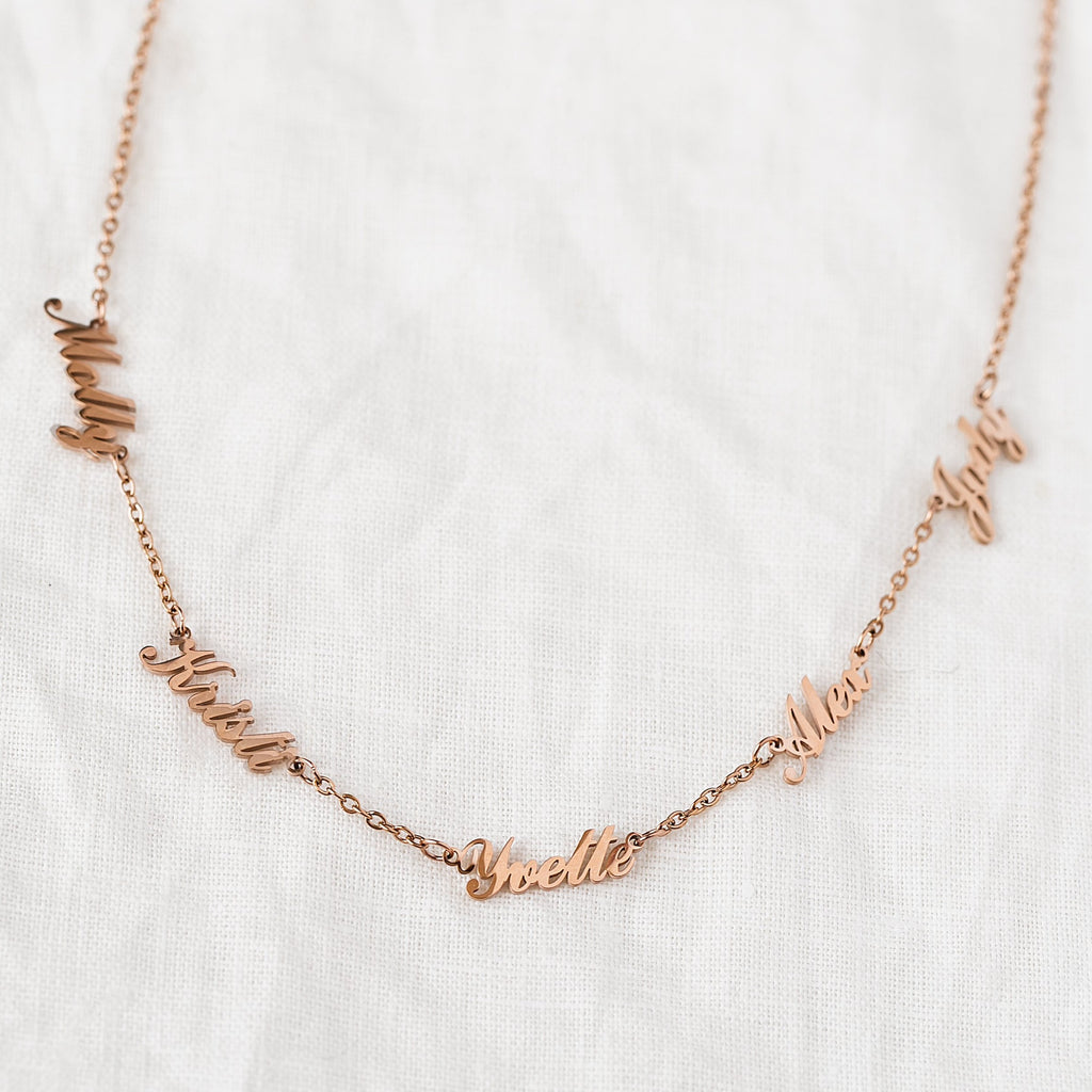 Wear up to five names in this beautiful piece of custom jewelry. The Multiple Name Necklace is so stunning that you would not want to take it off. Give yourself or someone you care about a personal gift that they'll cherish forever. Each necklace is handmade to perfection!