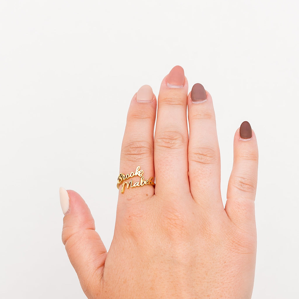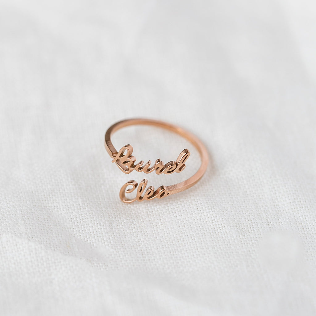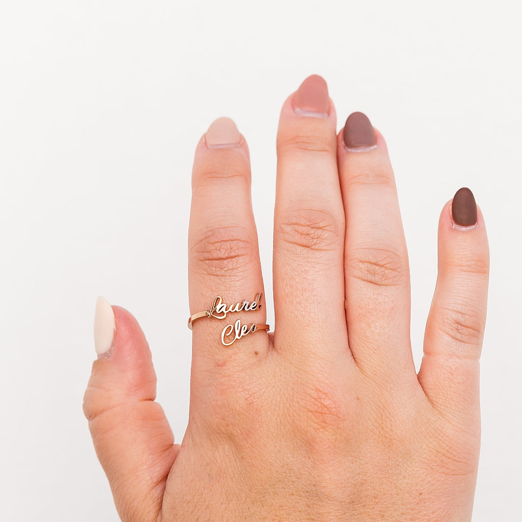 Personalize your own ring with two names! Our Double Name Ring has been incredibly popular for its unique look and customization! It goes with just about any outfit and is perfect for couples!