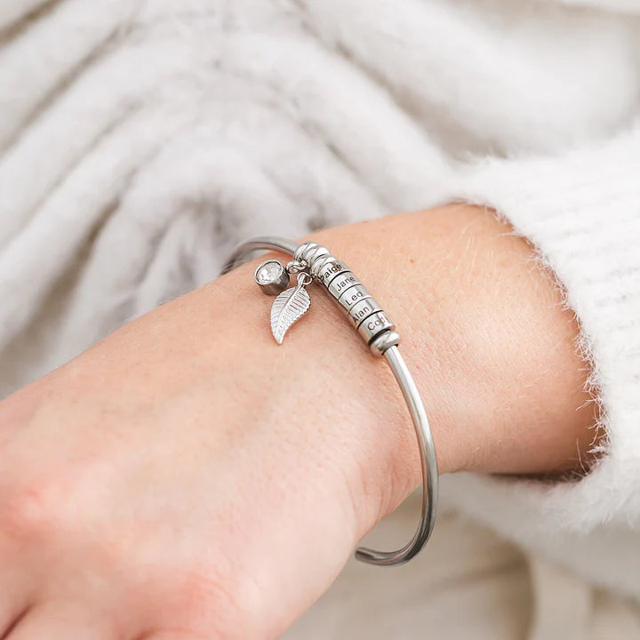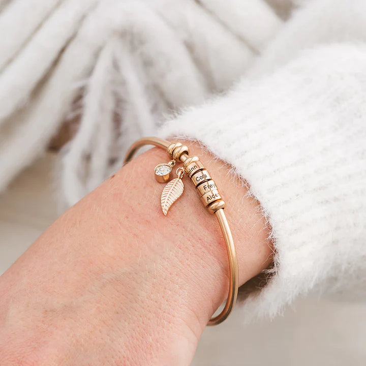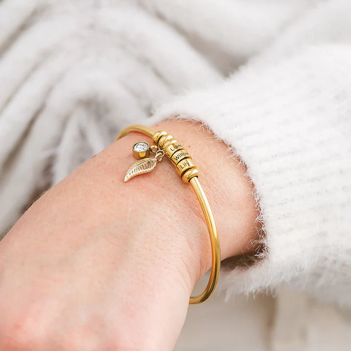 Open Bangle Bracelet with Custom Engraved Beads in 18K Gold Plating